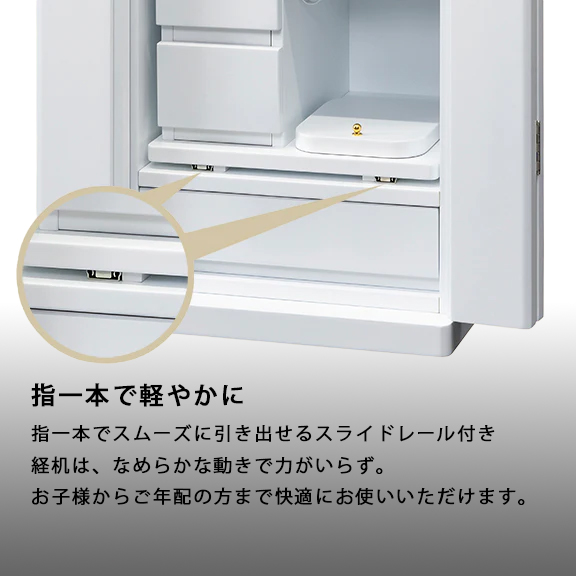 コンパクトながら、経机収納型・3か所の収納がつき機能面も充実しており、滑らかなウレタン塗装でお手入れも簡単です。何所に手をかけても開閉しやすい扉は、使用する人を選びません。